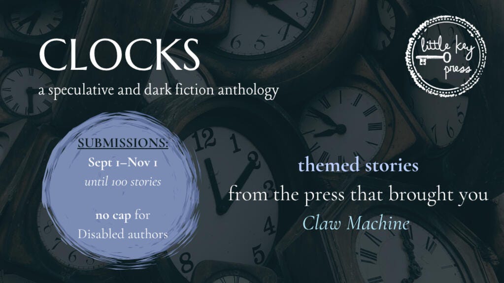 Never submitted work before? Don’t be afraid… LKP is looking for first-time authors who are working on dark speculative fiction along the theme of “clocks.” This op pays a nominal honorarium and contributors receive a paper copy of the anthology. More here.